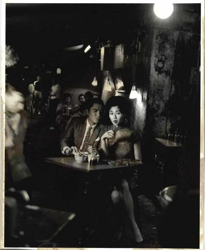 照片中,梁朝伟和张曼玉身穿戏服,坐在大排档,张曼玉正在喝一瓶玻璃瓶汽水、直视镜头,梁朝伟则盯着张曼玉手中的汽水。