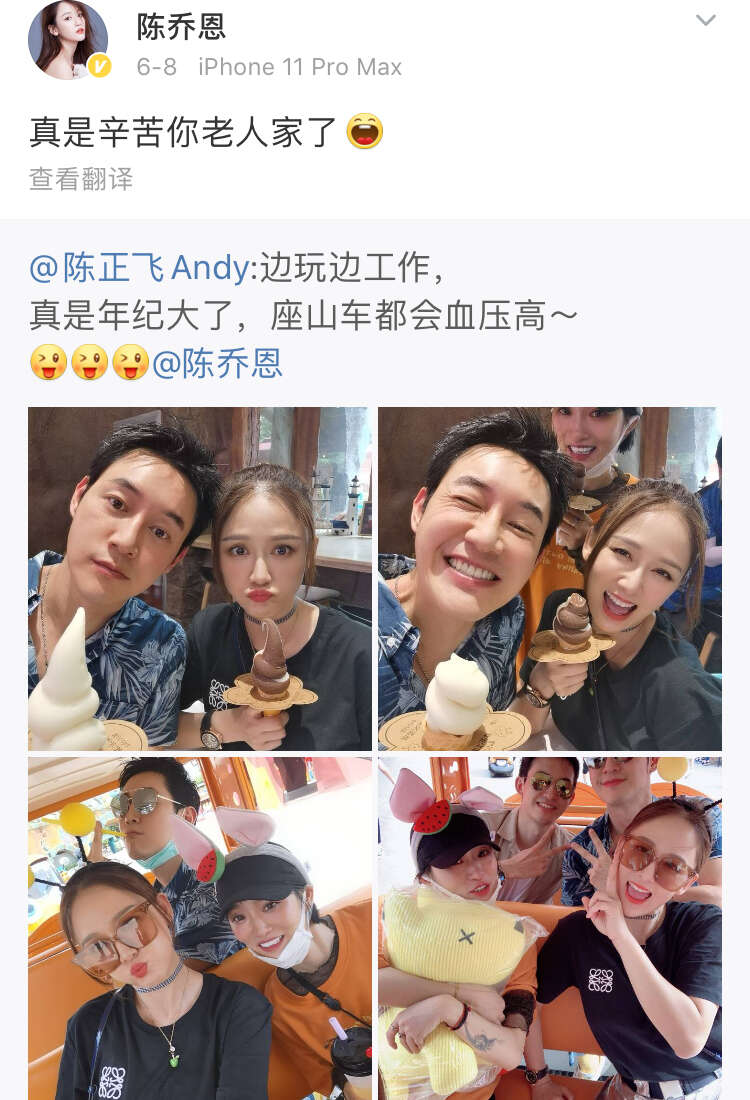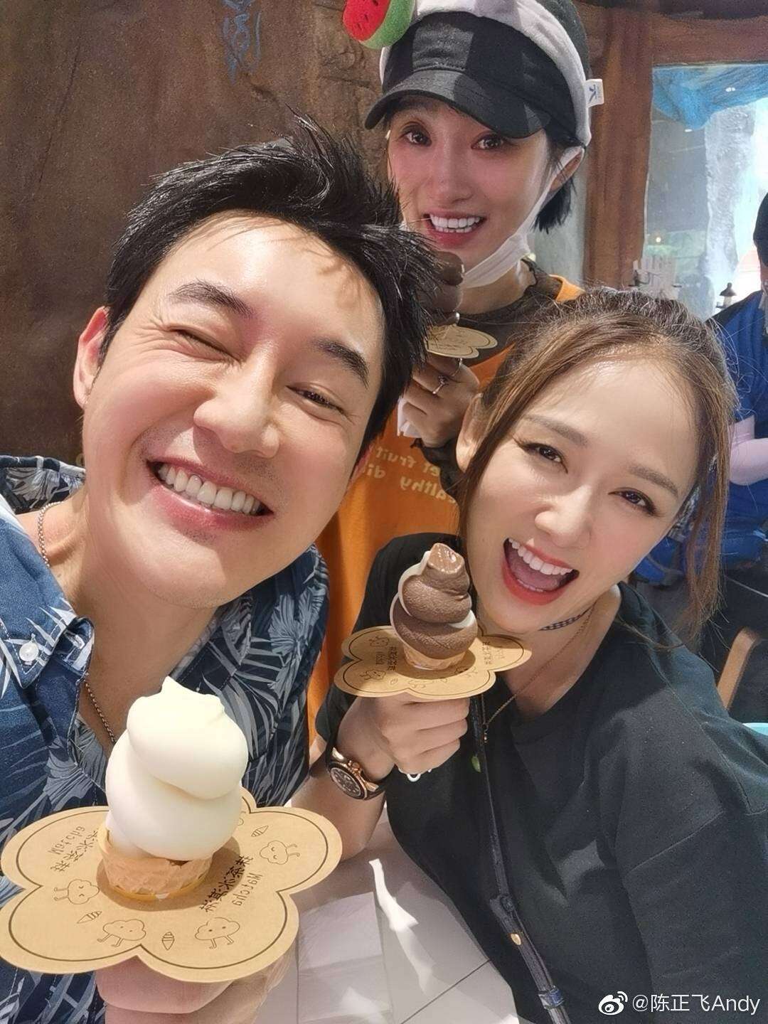 当天的出游照,陈正飞也放到了微博上,其中有两张便是他跟陈乔恩的单独合影,两人手握冰淇淋甜筒,一脸鬼马表情。陈正飞调皮发文说自己“年纪大了”,陈乔恩也转发说“真是辛苦你老人家了”,好友间的调侃颇为轻松自如。