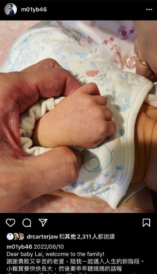 8月10日,阿娇前夫赖弘国在个人社交媒体官宣升级当爸,他晒出牵着婴儿的小手照并发文称:“谢谢勇敢又辛苦的老婆,陪我一起进入人生的新阶段,小赖宝要快快长大,然后要乖乖听妈
