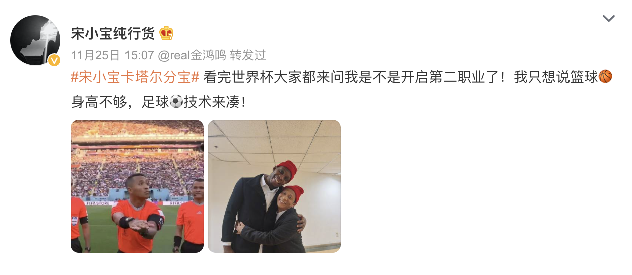对此,宋小宝发文回应:“看完世界杯大家都来问我是不是开启第二职业了!我只想说篮球身高不够,足球技术来凑!”