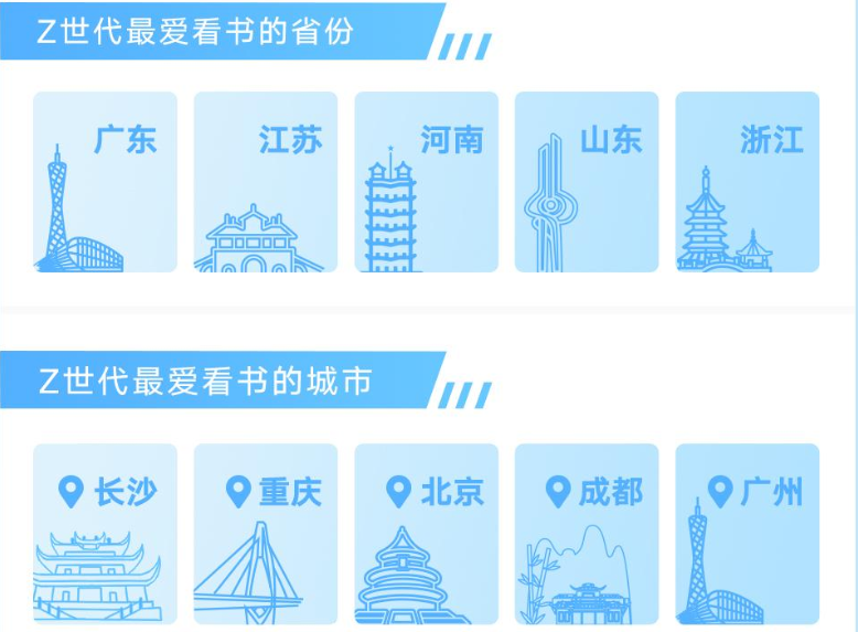 从地域上看,广东、江苏、河南、山东和浙江位列“Z世代”最爱读书省份TOP5。长沙、重庆、北京、成都、广州则跻身“Z世代”最爱读书城市。