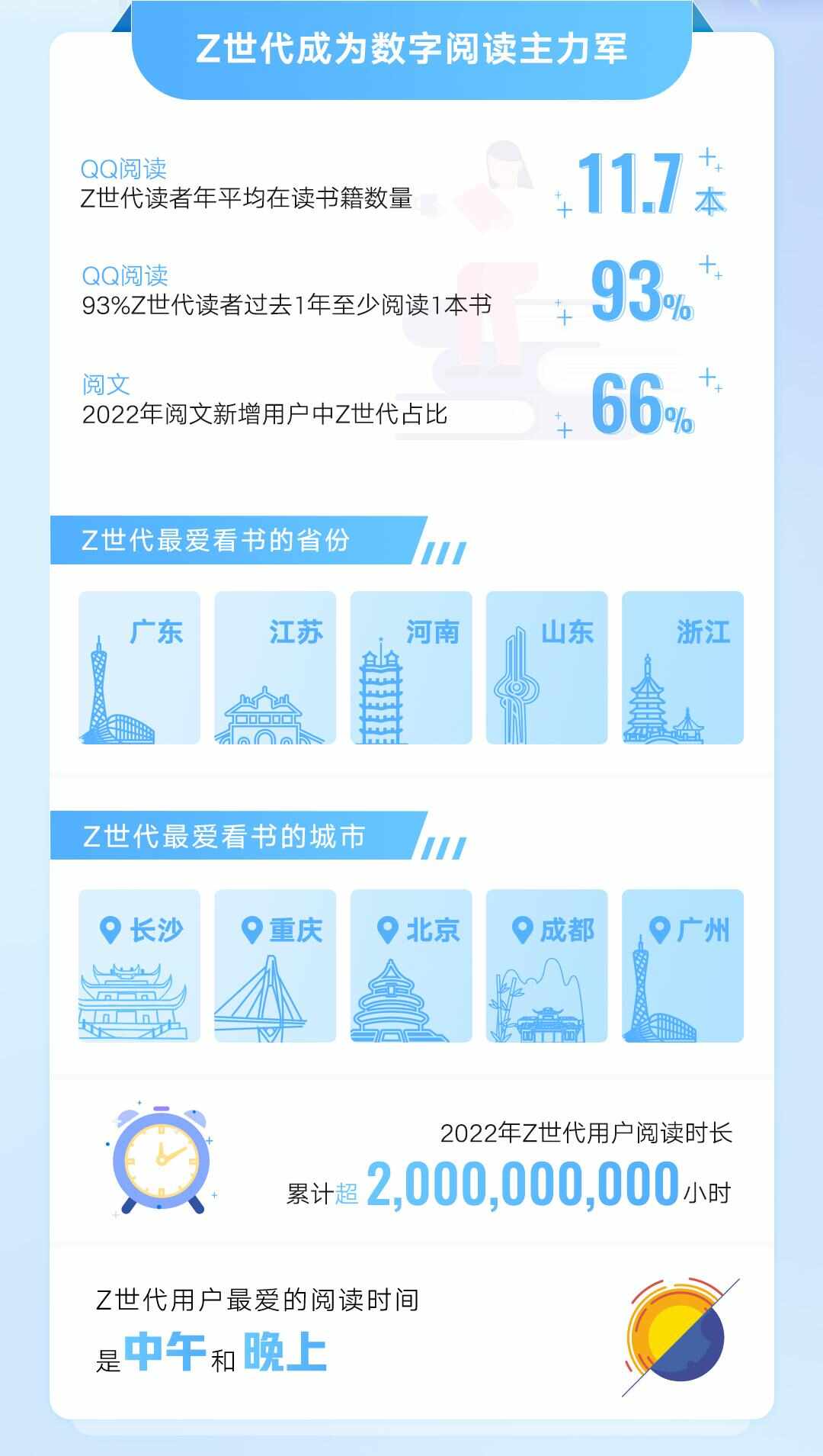 根据阅文集团旗下QQ阅读数据,近12个月来,93%的“Z世代”读者阅读了至少一本书,年平均在读书籍超11.7本。“Z世代”最爱的阅读时间是中午和晚上,中午12点和晚上10点是阅读高峰期。