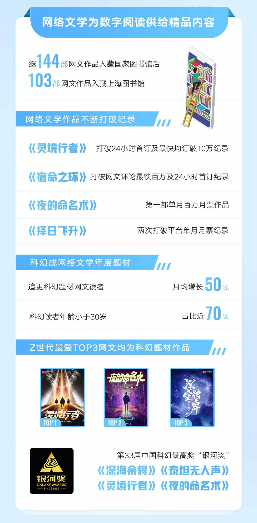 与此同时,科幻网文成网络文学年度题材,是2022年“Z世代”的最爱。数据显示,近70%的科幻读者年龄小于30岁。2022年阅文“Z世代”阅读人次TOP3网文为《灵境行者》《夜的命名术》《深空彼岸》,均属科幻题材作品。