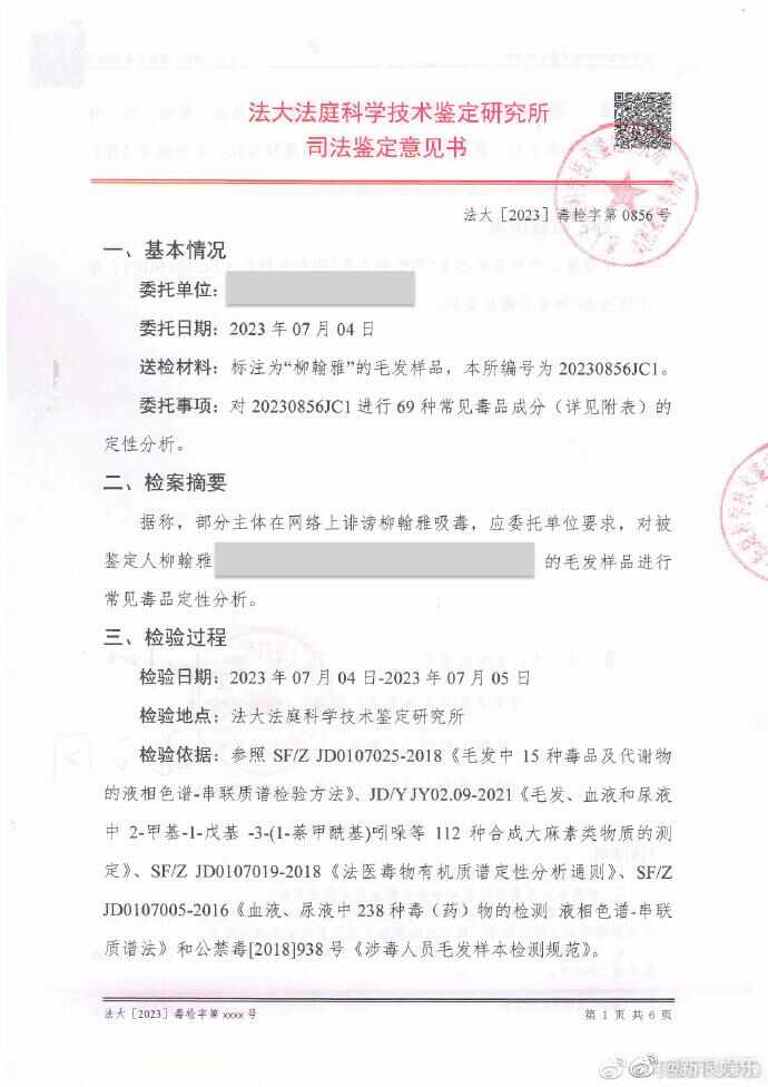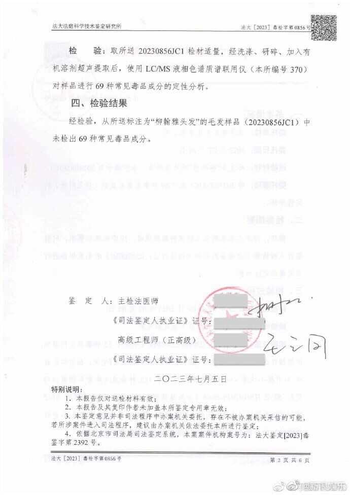 7月5日,阿雅工作室晒出毛发及尿液检测报告再次否认阿雅吸毒,检测报告显示“柳翰雅尿液样本中未检出69种常见毒品成分”。