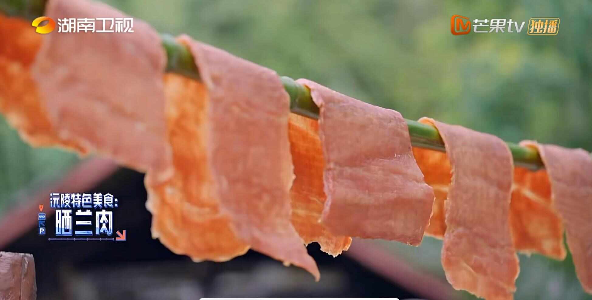 第二站,沅陵的地理位置很特别——两山夹两水,两山是指雪峰山和武陵山,两水则是沅水和酉水。在这里,“放排”曾是一种谋生手段,指挥者为了提醒兄弟们险滩、暗礁之所在,有了“喊号子”的习俗。汪涵也跟着当地人体验了一把,顿时感觉自己浑身是劲。特殊的生活方式也催生了特别的食物,比如晒兰肉——将猪肉滚刀片成肉板,充分腌制后风吹晒干,便于存储和携带。长期在外放排的男子吃到晒兰肉,就会想到家里的妻子正期盼自己早日归来。