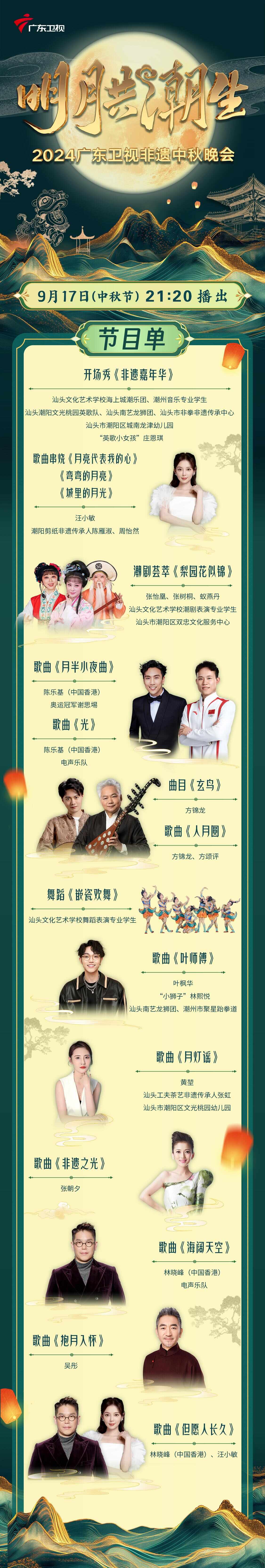 9月17日21:20,《“明月共潮生”2024广东卫视非遗中秋晚会》将陪伴观众一起过中秋!本场晚会以“团圆”和“非遗传承”为核心,在“月满潮生·共赏非遗”的主题下,奥运冠军谢思埸,携手吴彤、方锦龙、林晓峰、汪小敏、陈乐基、方颂评、叶枫华、黄堃、张朝夕等嘉宾,通过现场表演、打卡体验、赏月漫谈等形式,深度挖掘广东非物质文化遗产,让非遗在新时代下借“月”出圈!