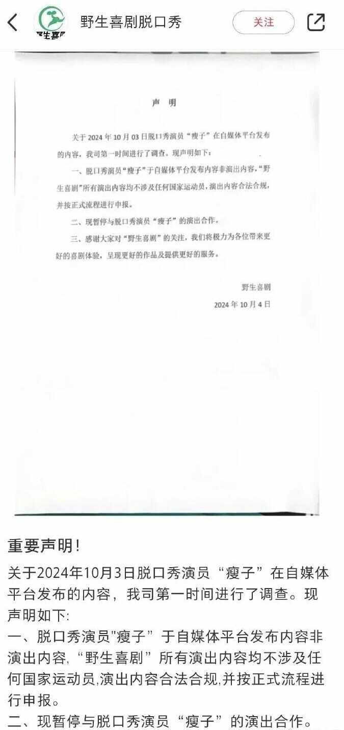 10月4日,其演出公司野生喜剧发声明回应称,“瘦子”于自媒体平台发布的视频并非演出内容,并将暂停与“瘦子”的演出合作。