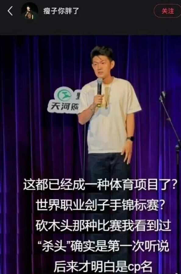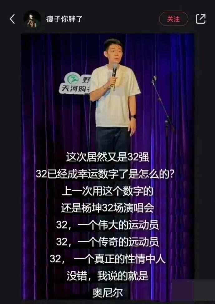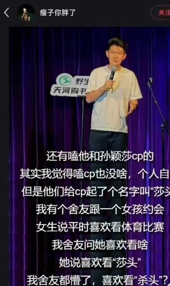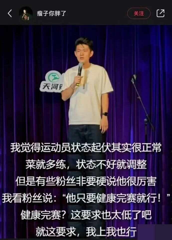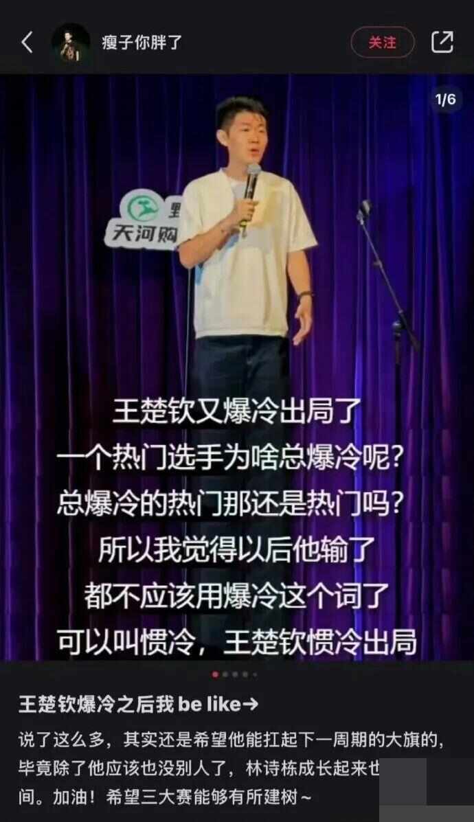 近日,脱口秀演员“瘦子”在其自媒体账号上发布视频调侃国乒选手王楚钦,称王楚钦在巴黎奥运会、WTT中国大满贯等赛事接连输球出局不叫“爆冷”叫“惯冷”、“32”是王楚钦的“幸运数字”,引发关注。