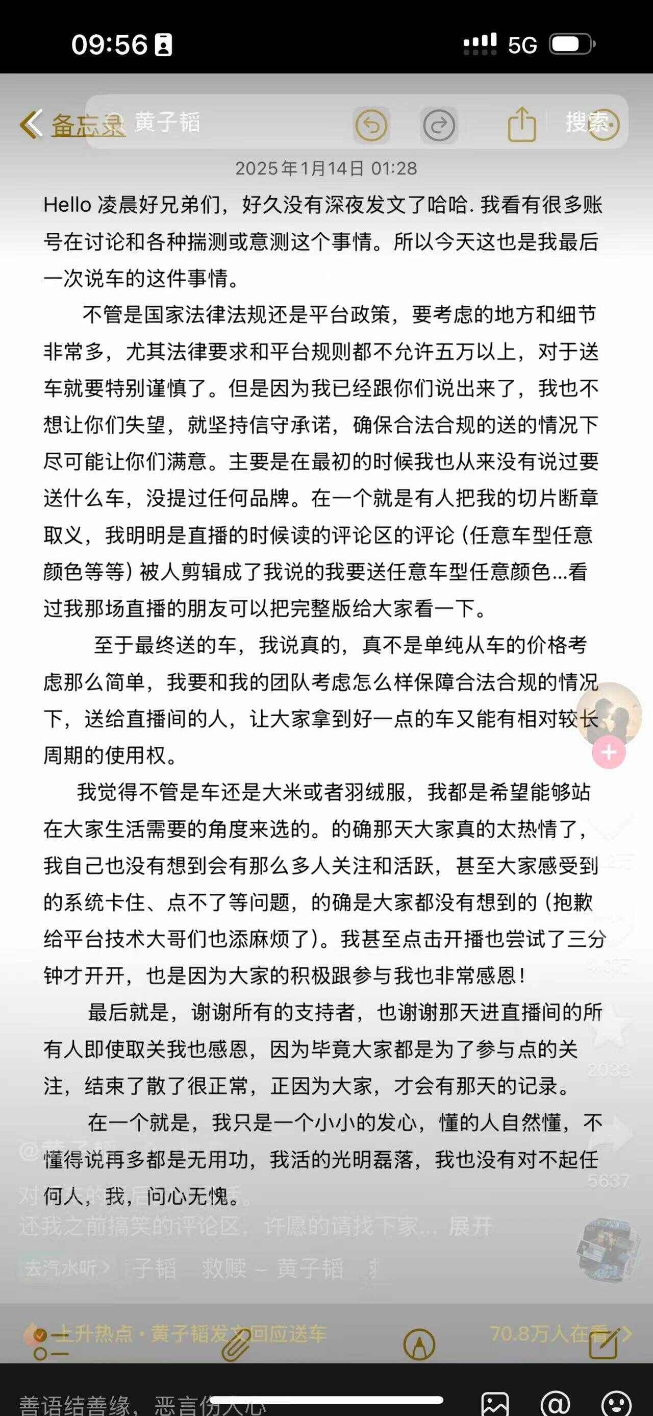 1月14日,黄子韬发文称,自己已尽力“信守承诺”。他表示,因法律要求和平台政策,抽奖金额不允许超过5万,此外他从未表明要送哪个品牌的车,但有人将其直播内容切片,断章取义为“送任意车型任意颜色”。
