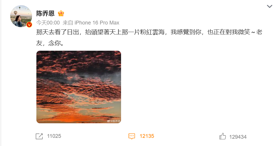 今年9月16日是乔任梁去世九周年忌日,而陈乔恩也已连续九年发文纪念乔任梁。因乔任梁生前喜欢粉色,陈乔恩每年都会分享粉色天空纪念好友。