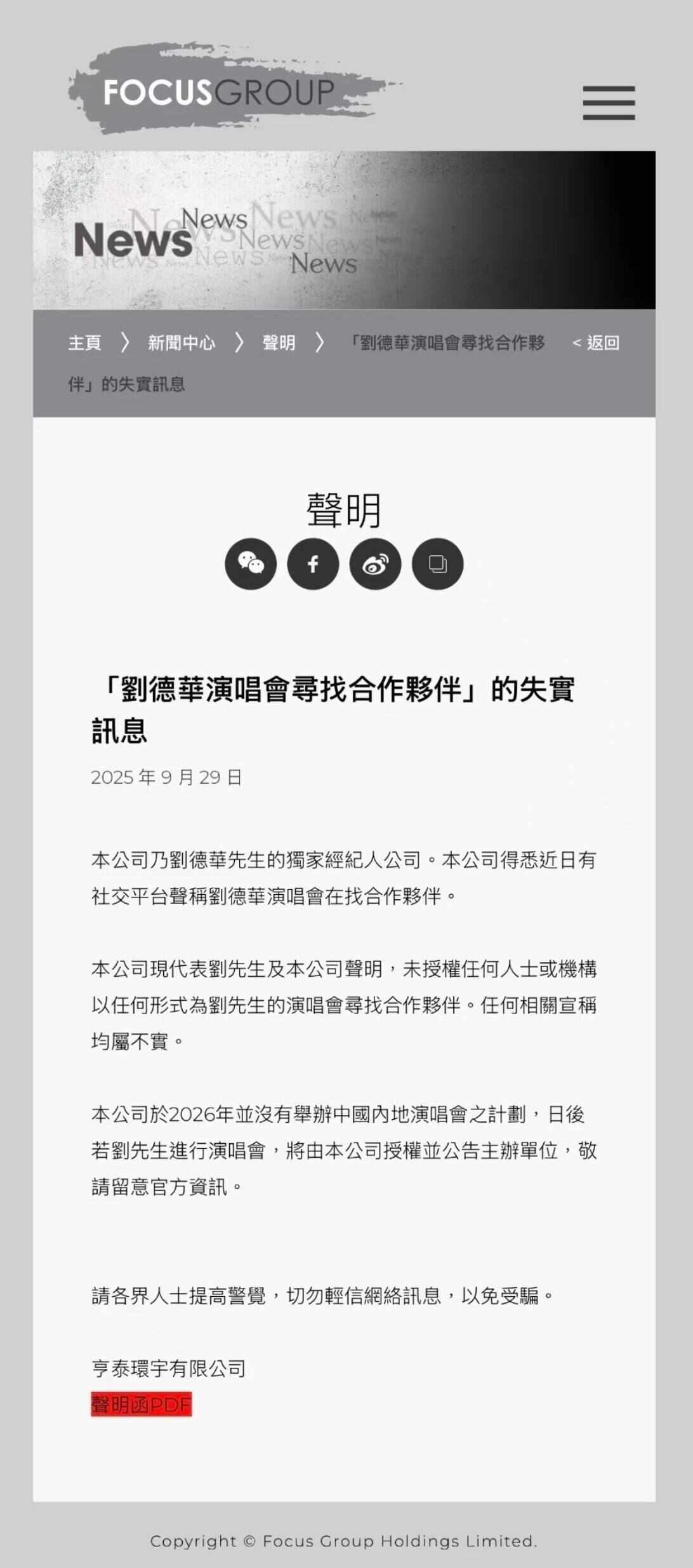 本公司乃刘德华先生的独家经纪人公司。本公司得悉近日有社交平台声称刘德华演唱会在找合作伙伴。