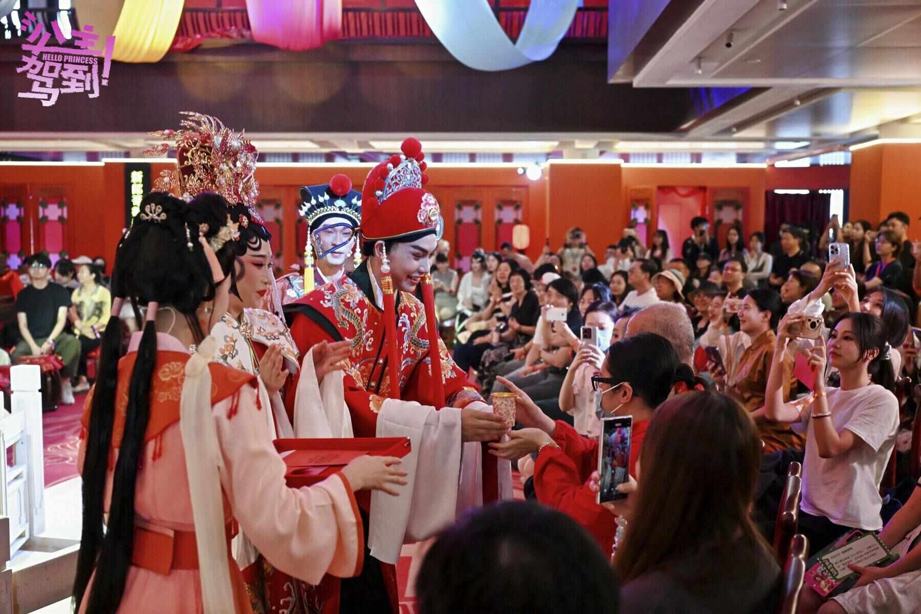 25岁的广州姑娘阿欣难掩兴奋,她手中的“金枝席”身份卡显示为“贵族香友”,刚完成协助升平公主选花调香的互动任务。在她看来,千平实景打造的婚礼场景充满广府风情,巨大的非遗木艺灯笼与并蒂莲纹样布景让人瞬间“入戏”,“从递红包道贺到参与敬茶仪式,全程像真的在参加一场古雅婚宴,粤剧唱腔混着现代编曲,不懂粤剧也听得入迷。”她感慨:“本来只是想着带爸妈来体验一下,因为他们很喜欢粤剧。以前觉得粤剧老套。现在我跟他们一样都变成了‘公主粉’,爸妈还问‘下次什么时候再演’。”