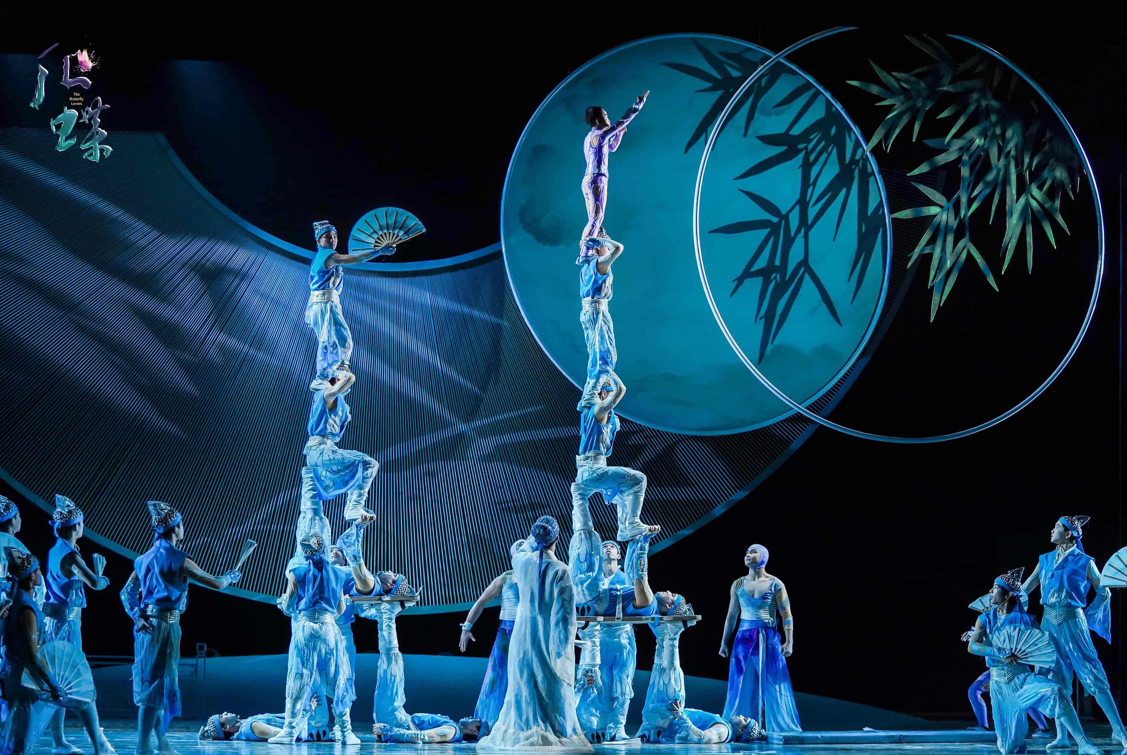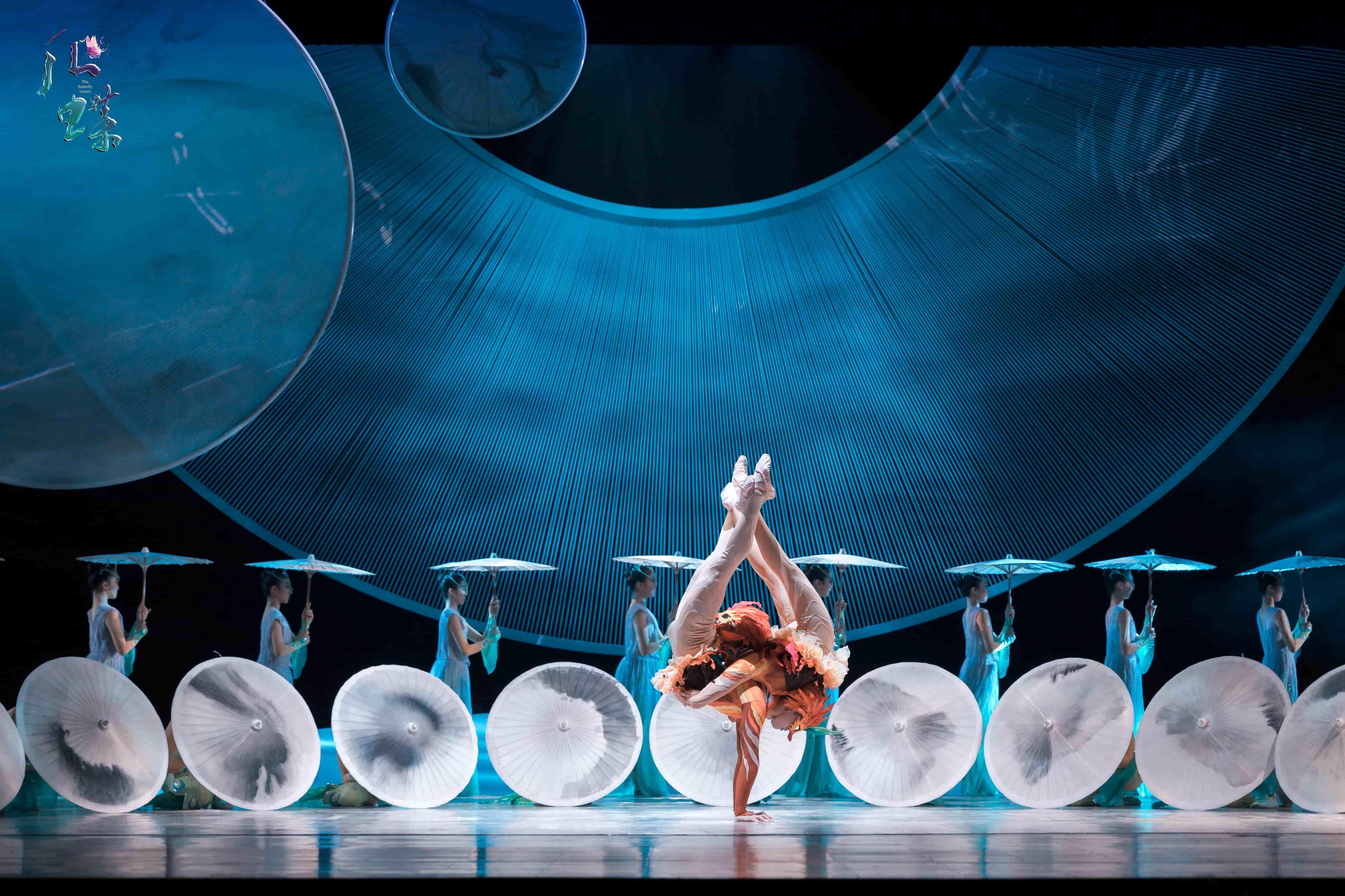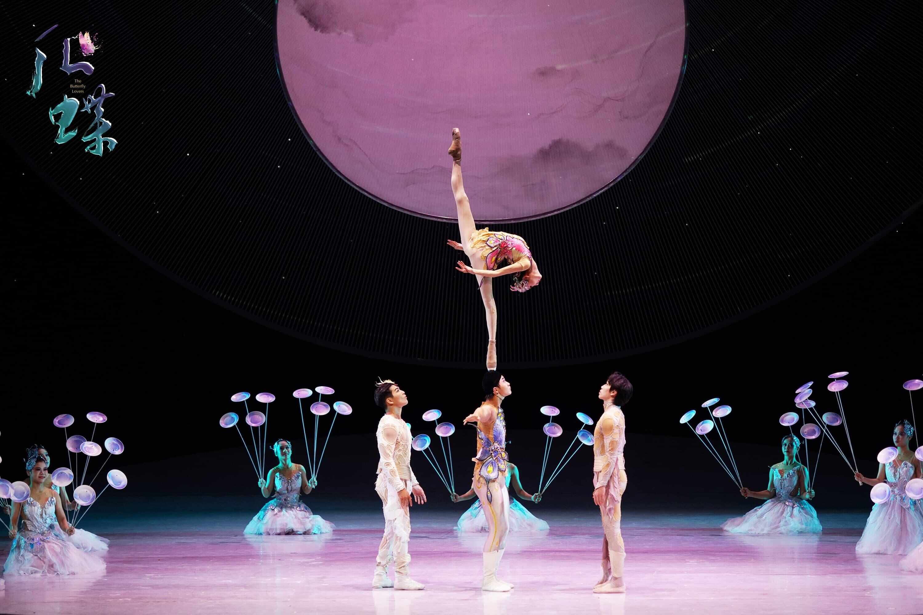 剧中,《化・蝶》以创新艺术手法,将32项高难杂技与舞蹈、戏剧完美融合,通过惊艳的“肩上芭蕾”“双人蹬伞”“空竹”等独特表演形式,重新诠释了这个经典爱情故事。