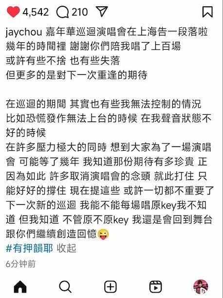 周杰伦发文告别“嘉年华”巡演。