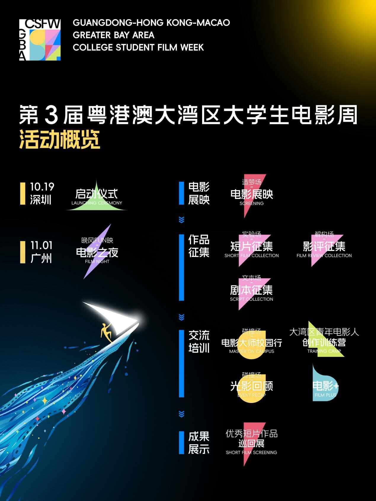 备受瞩目的第3届粤港澳大湾区大学生电影周,将于10月19日在深圳大学粤海校区演会中心正式启动,诚邀大湾区青年学子一同“驭光同行”,在帧帧影像中遇见未来。