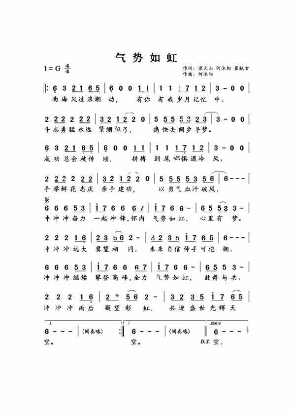 10月25日,中华人民共和国第十五届运动会会歌《气势如虹》粤语版MV正式发布。歌曲由中国音乐家协会副主席、深圳大学金钟音乐研究院院长何沐阳作曲,梁天山、何沐阳、崔轼玄作词;MV由粤港澳三地歌手古巨基、曾舜晞、罗嘉豪联袂演绎。
