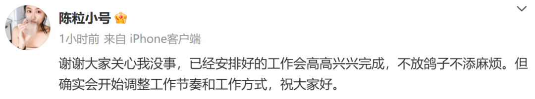 随后,@陈粒小号 发文回应:谢谢大家关心我没事,已经安排好的工作会高高兴兴完成,不放鸽子不添麻烦。但确实会开始调整工作节奏和工作方式,祝大家好。