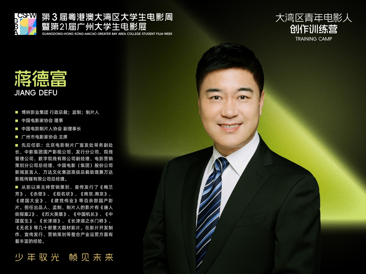 活动标志着聚焦于培育大湾区电影新力量的年度盛事拉开帷幕。开营当日,中国电影家协会理事、中国电影制片人协会副理事长、广州市电影家协会主席、博纳影业集团行政总裁,资深电影监制、制片人蒋德富到场为训练营带来首场主题讲座,并与训练营学生进行了深度交流。