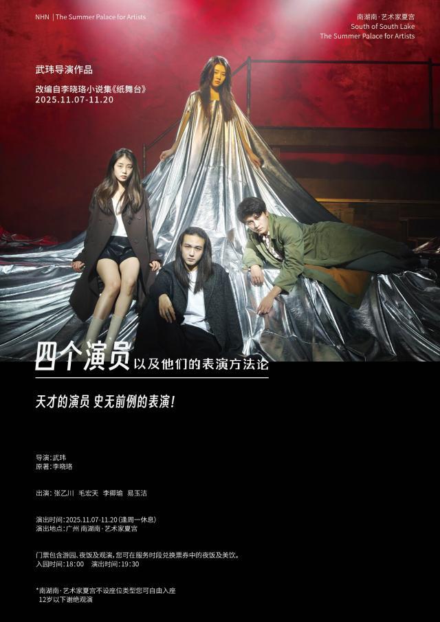 南湖南·艺术家夏宫新剧《四个演员以及他们的表演方法论》将于2025年11月7日至20日开启首轮公演。该剧改编自李晓珞小说集《纸舞台》的第四篇《御龙山路58-4-1304》,是《纸舞台》戏剧系列的第三部。