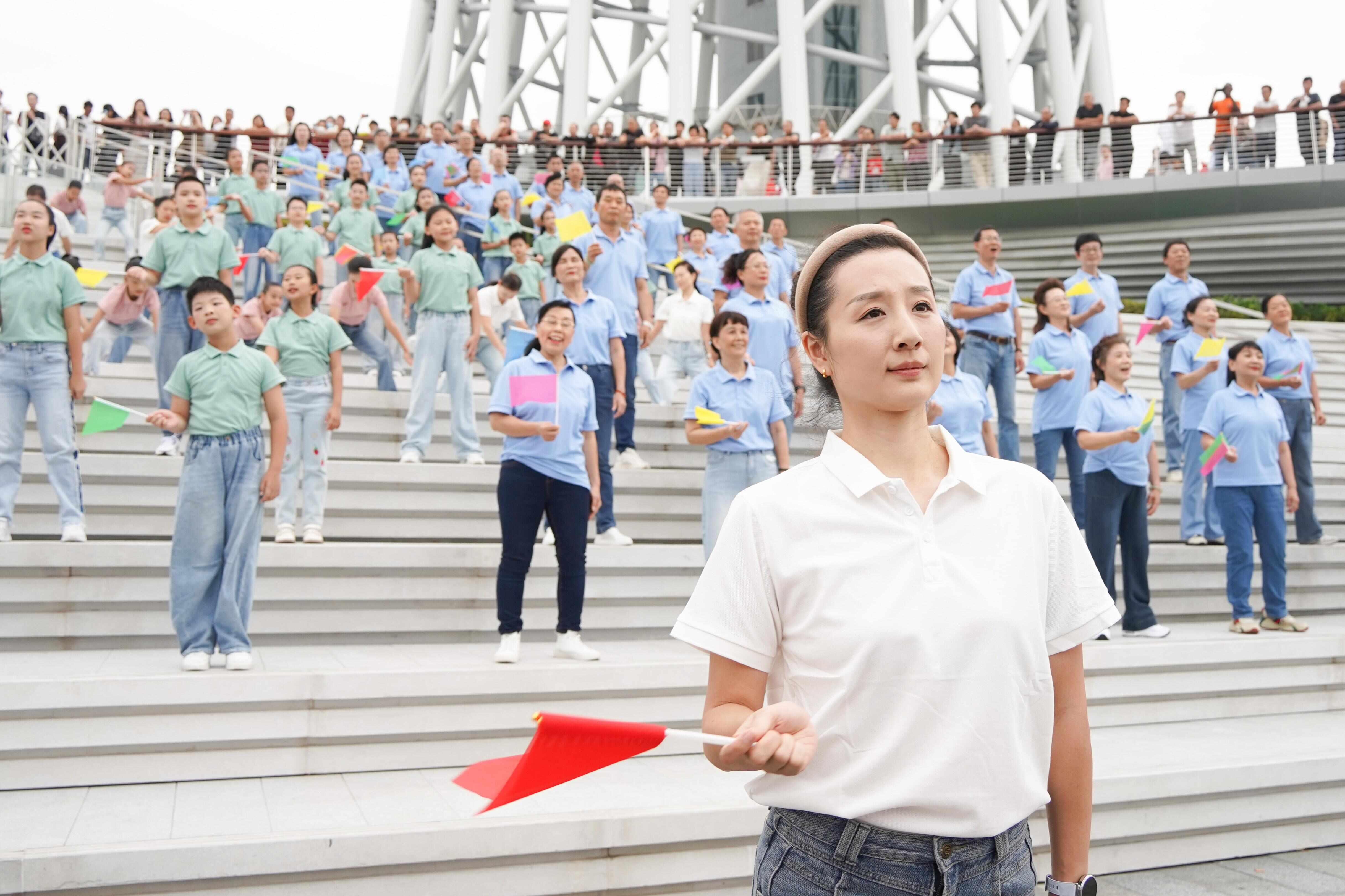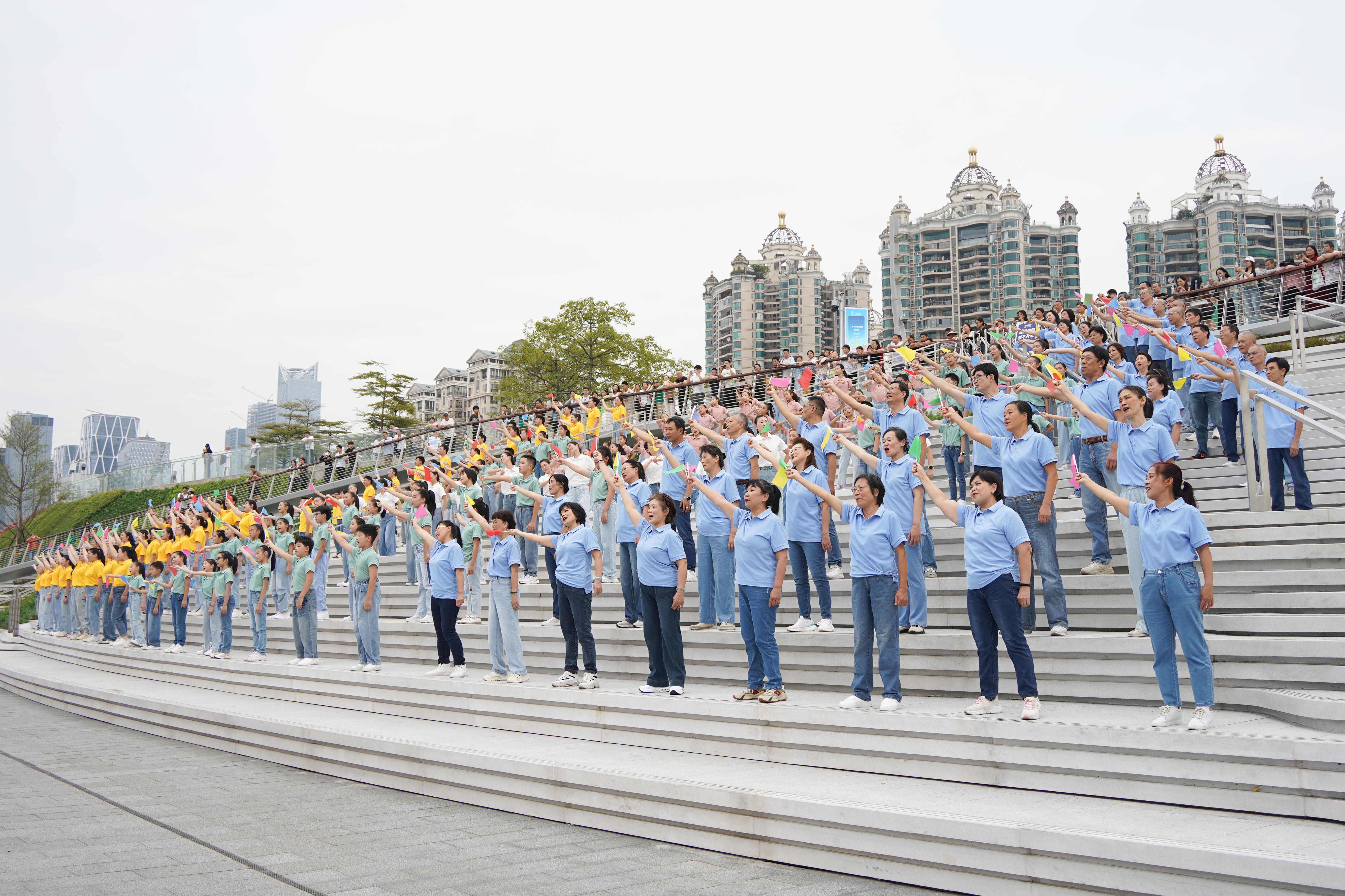 15时30分,传唱活动在广州塔进入高潮。广东省文化馆五个艺术团联袂登场,各展风采。少年合唱团的清澈歌声、青年合唱团的激昂活力与老年合唱团的醇厚音韵彼此呼应,少儿及老年舞蹈团则以动感洋溢的舞步点燃全场。在《大家一起来》的欢快节奏中,现场观众随之互动,气氛热烈;随后奏响的会歌《气势如虹》,更以恢弘大气的旋律,将现场情绪进一步推升。许多上午刚观看过火炬传递的市民游客闻声而来,跟随节拍鼓掌、哼唱,感受“上午看火炬,下午齐唱响”的全天候全运体验。