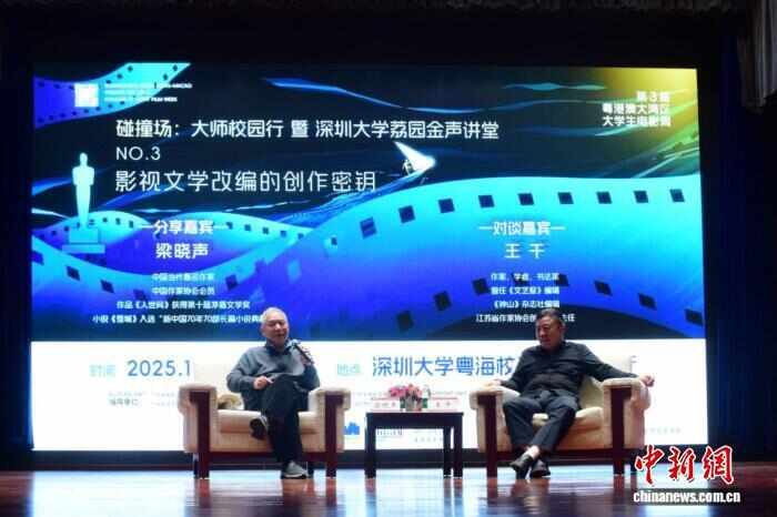 中新网深圳11月3日电 (索有为 黄海纯 张炜童)第十届茅盾文学奖得主、著名作家梁晓声,第五届鲁迅文学奖获得者、作家兼学者王干,2日下午亮相深圳大学“荔园金声讲堂”暨第3届粤港澳大湾区大学生电影周“碰撞场:电影大师校园行”活动,围绕“影视文学改编的创作密钥”展开深度对话。