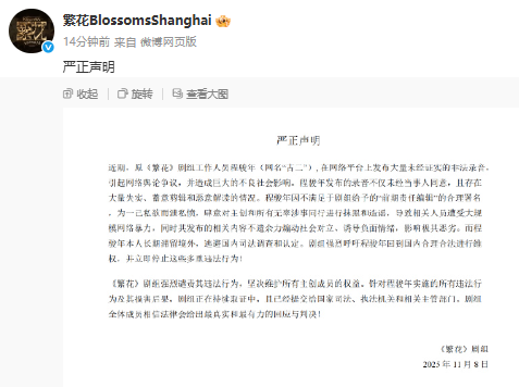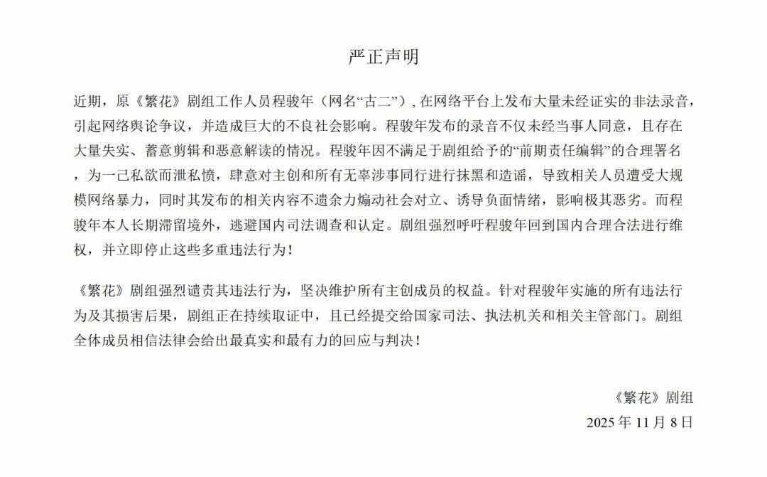 近期,原《繁花》剧组工作人员程骏年(网名“古二”), 在网络平台上发布大量未经证实的非法录音,引起网络舆论争议,并造成巨大的不良社会影响。程骏年发布的录音不仅未经当事人同意,且存在大量失实、蓄意剪辑和恶意解读的情况。程骏年因不满足于剧组给予的“前期责任编辑”的合理署名,为一己私欲而泄私愤,肆意对主创和所有无辜涉事同行进行抹黑和造谣,导致相关人员遭受大规模网络暴力,同时其发布的相关内容不遗余力煽动社会对立、诱导负面情绪,影响极其恶劣。而程骏年本人长期滞留境外,逃避国内司法调查和认定。剧组强烈呼吁程骏年回到国内合理合法进行维权,并立即停止这些多重违法行为!