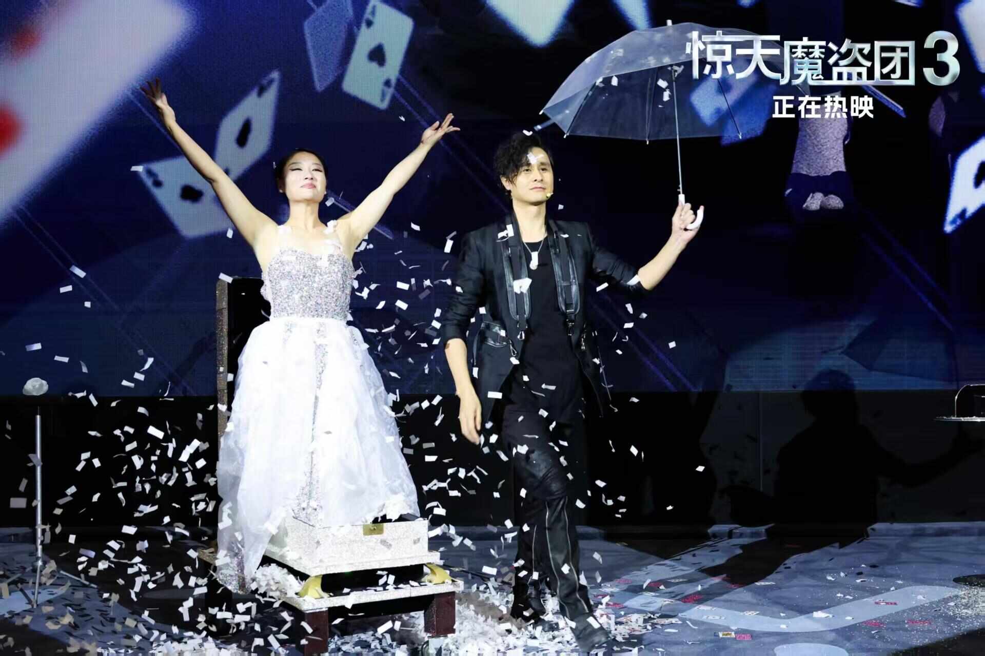 11月13日晚,影片在北京举办中国首映礼。魔术师刘世杰、孙峥还原“飞牌奇迹”“钻石爆破”“雪花变装”等精彩魔术场面,更融入中国传统戏法。影片中文推广曲演唱者黄子弘凡现身参与魔术互动,将影片“马上有钱”的好运送给观众。