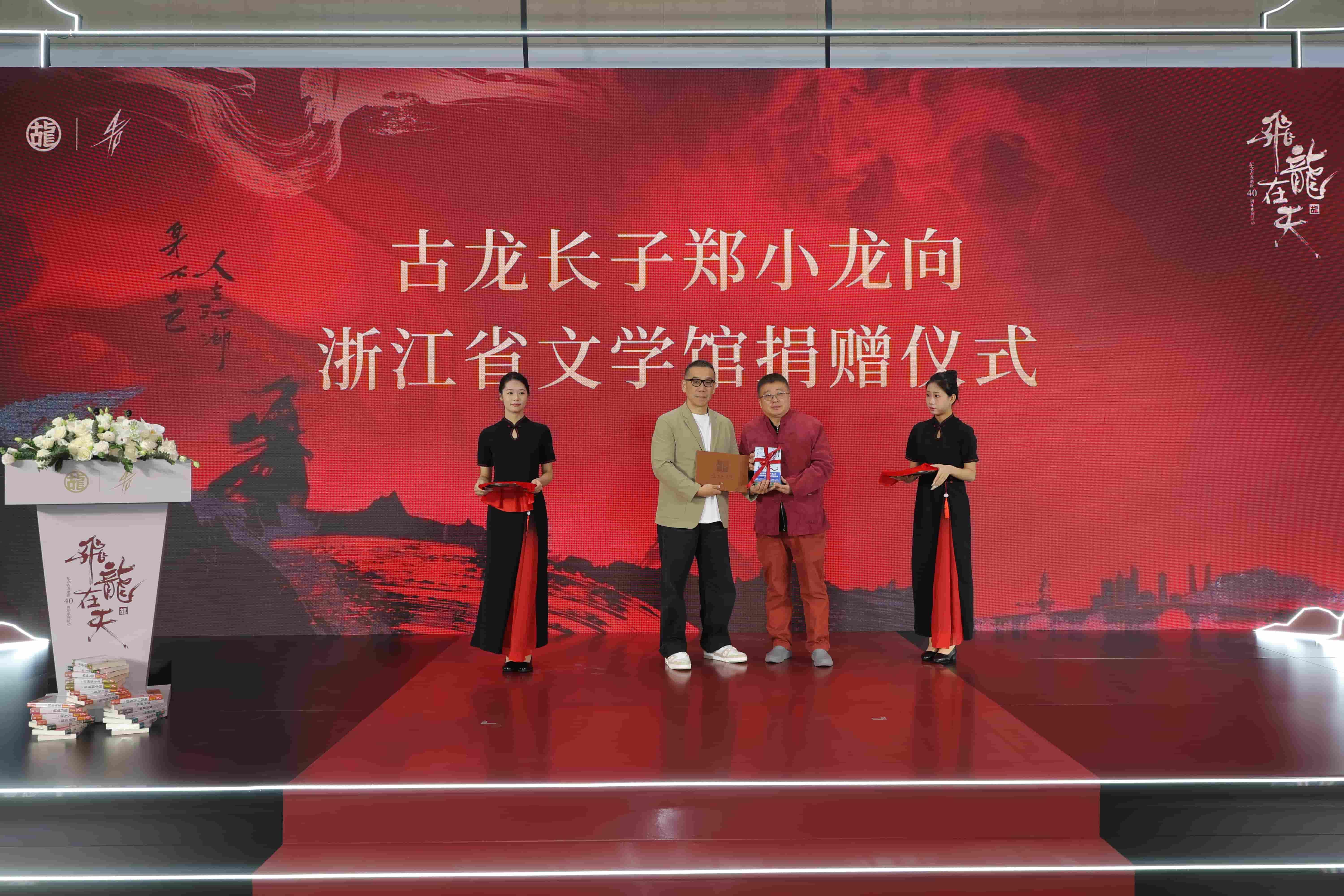 古龙长子郑小龙隆重出席仪式,向浙江省文学馆捐赠珍贵的古龙全集及评论系列套书,据悉,这套绝版的珍贵藏书来自古龙先生生前挚友陈晓林。