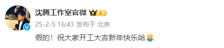 沈腾工作室发文辟谣:“假的!祝大家开工大吉新年快乐哈”,否认恋情传闻。