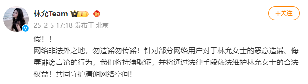 今年4月,林允方律师发表声明显示,该案件被告通过捏造有关林允女士私生活的虚假情节,公开进行诽谤以博取流量,对林允女士形象与声誉造成恶劣影响。