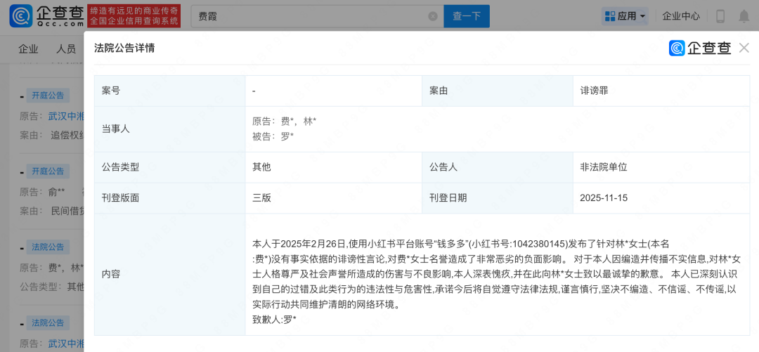 企查查App显示,近日,法院刊登罗某某向林允@林允Jelly 道歉声明。内容显示,其发布了针对林允女士(本名:费霞)没有事实依据的诽谤性言论,造成了非常恶劣的负面影响。对于因编造并传播不实信息,对林允女士人格尊严及社会声誉所造成的伤害与不良影响,深表愧疚,向林允女士致以最诚挚的歉意。