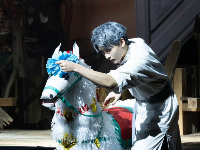 据悉,《慕容英二三事》第二轮公演时间为2025年12月4日至17日,逢周一休息。这部作品从解构中回归神圣建构的试探,以超现实主义的道具与表现等现当代戏剧手法来还原人物和舞台的神性。在2025年的岁末,邱伟杰导演用“鲜花”战胜“刀剑”的现代派语汇,将爱情与战争的传奇故事再次全新呈现。