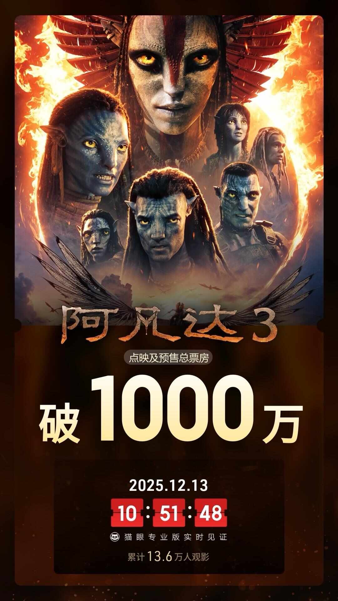 据猫眼专业版数据,截至12月13日10:51,电影《阿凡达:火与烬》(又名《阿凡达3》)映前6天,点映及预售总票房突破1000万元。