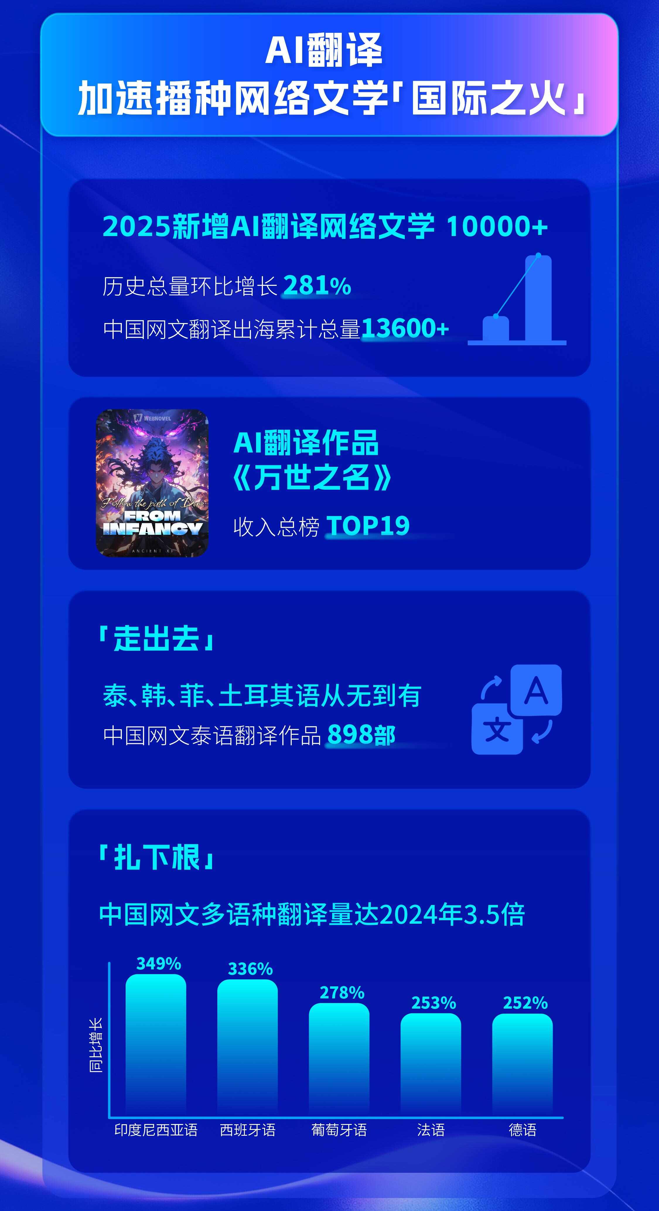 《2025中国网络文学出海趋势报告》指出,在2025年,AI翻译进一步实现了规模化应用,WebNovel全年新增AI翻译作品超10000部,历史总规模环比增长达281%,其质量也受到读者广泛认可,中国网文《万世之名》进入平台收入总榜TOP19。