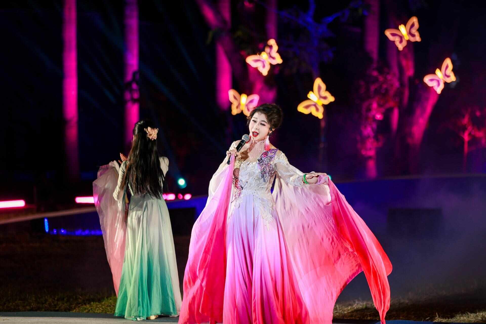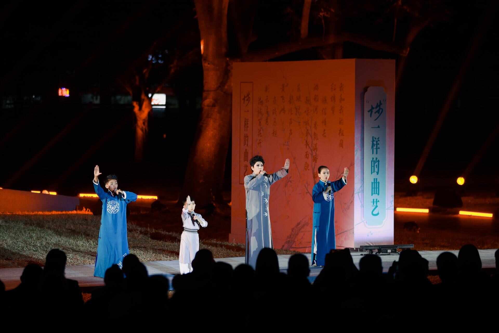 本次演出打破传统剧场的镜框式舞台,文化广场公园小树林、绿草坪、曲径幽径皆为舞台,与灯光呼应,化身沉浸式叙事场景,现场观众落座其中。“零距离”的舞台体验,让表演者与观众共同沉浸在全新的互动氛围中,是探索国家非遗粤曲创造性转化、创新性发展的一次生动实践。
