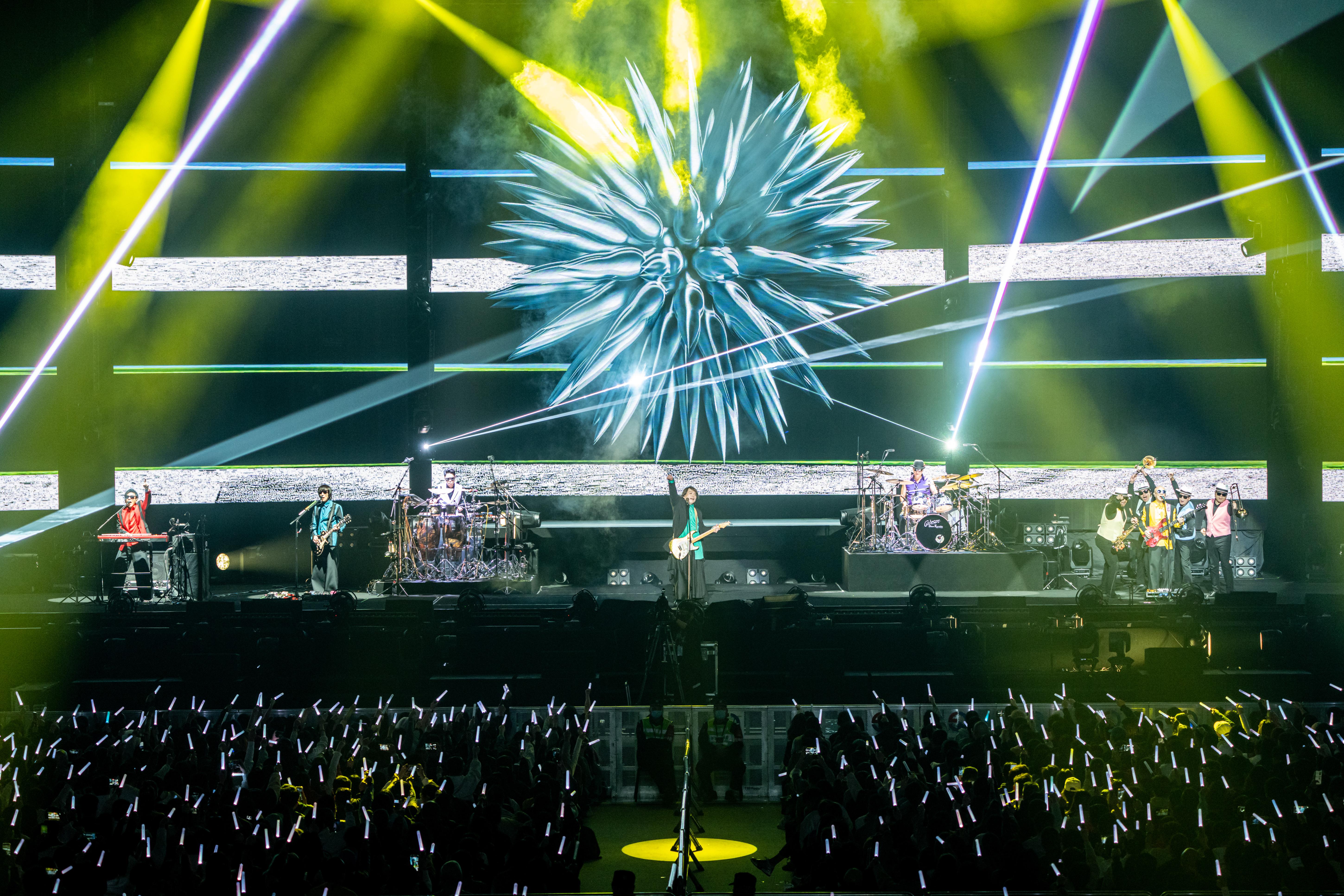 作为“Rock Star”(摇滚明星)的伍佰果然不按常理出牌,他没有选择讨好耳朵的热歌暖场,而是以《上瘾了》《风火》《黄色月亮》三首冷冽、迷幻又带些怪诞的硬派摇滚作品开篇,瞬间将观众拉入专属于伍佰的独特摇滚美学世界。