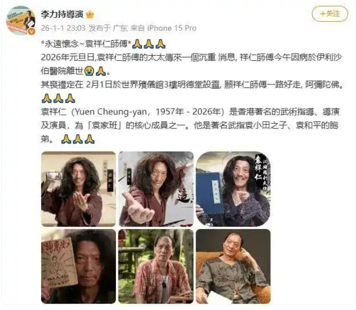 2026年元旦午时,香港影坛传来一则令人黯然的消息。据导演李力持在社交平台公布及家属讣告确认,香港著名武术指导、演员袁祥仁于香港伊利沙伯医院病逝,享年69岁。其丧礼定于2026年2月1日在香港世界殡仪馆设灵。