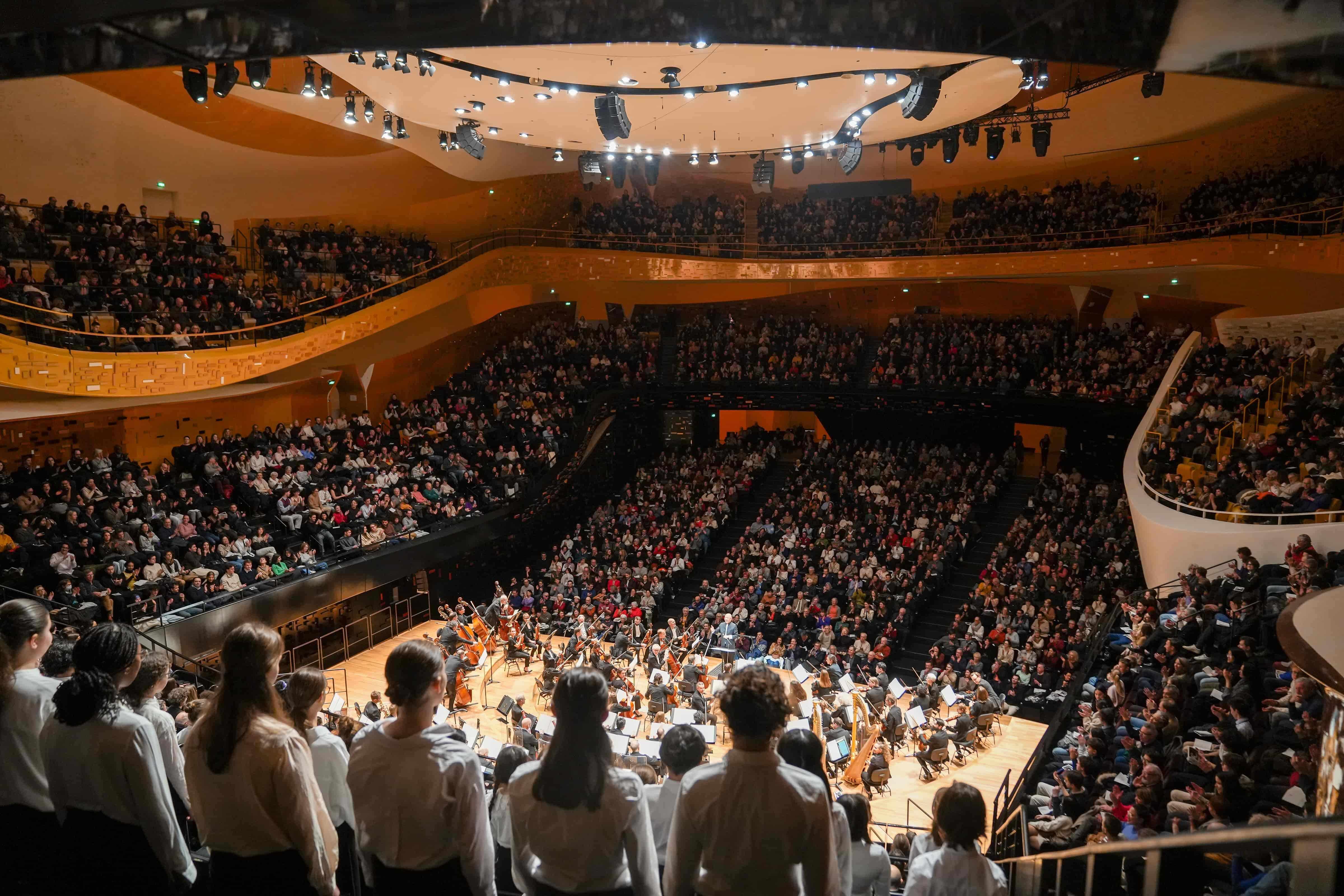 众所周知,巴黎管弦乐团作为世界顶级交响乐团,在演绎法国作品上拥有无可撼动的权威。此次,乐团更是罕见集结了巴黎管弦乐团合唱团、青年合唱团与儿童合唱团,以逾300人的恢弘阵容,在棕黑色观众席与金色木质舞台相映的“黑金大厅”中,奏响了恢弘与典雅兼具的新年乐章。